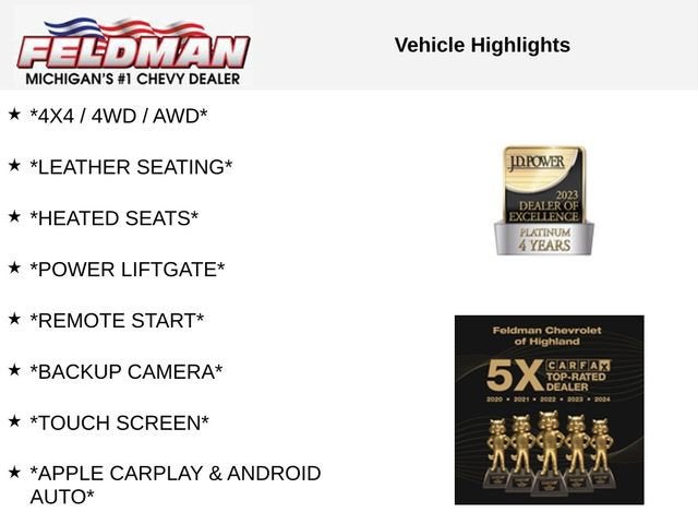 *4X4 / 4WD / AWD*, *LEATHER SEATING*, *HEATED SEATS*, *POWER LIFTGATE*, *REMOTE START*, *BACKUP CAMERA*, *TOUCH SCREEN*, *APPLE CARPLAY & ANDROID AUTO*, *Bluetooth®*, *SATELLITE RADIO SIRIUS XM*, *LOCAL TRADE*, *VEHICLE LOCATED AT FELDMAN CHEVROLET OF HIGHLAND CALL (248) 889-3232*, *GENERAL MOTORS AWARD TOP CUSTOMER SERVICE DEALERSHIP IN METRO DETROIT*, 4WD.
